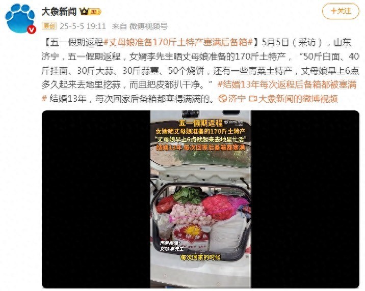 5月5日(采访),山东济宁,五一假期返程,女婿李先生晒丈母娘准备的170斤土特产,“50斤白面、40斤挂面、30斤大蒜、30斤蒜薹、50个烧饼,还有一些青菜土特产,丈母娘早上6点多久起来去地里挖蒜,而且把皮都扒干净。”结婚13年,每次回家后备箱都塞得满满的。